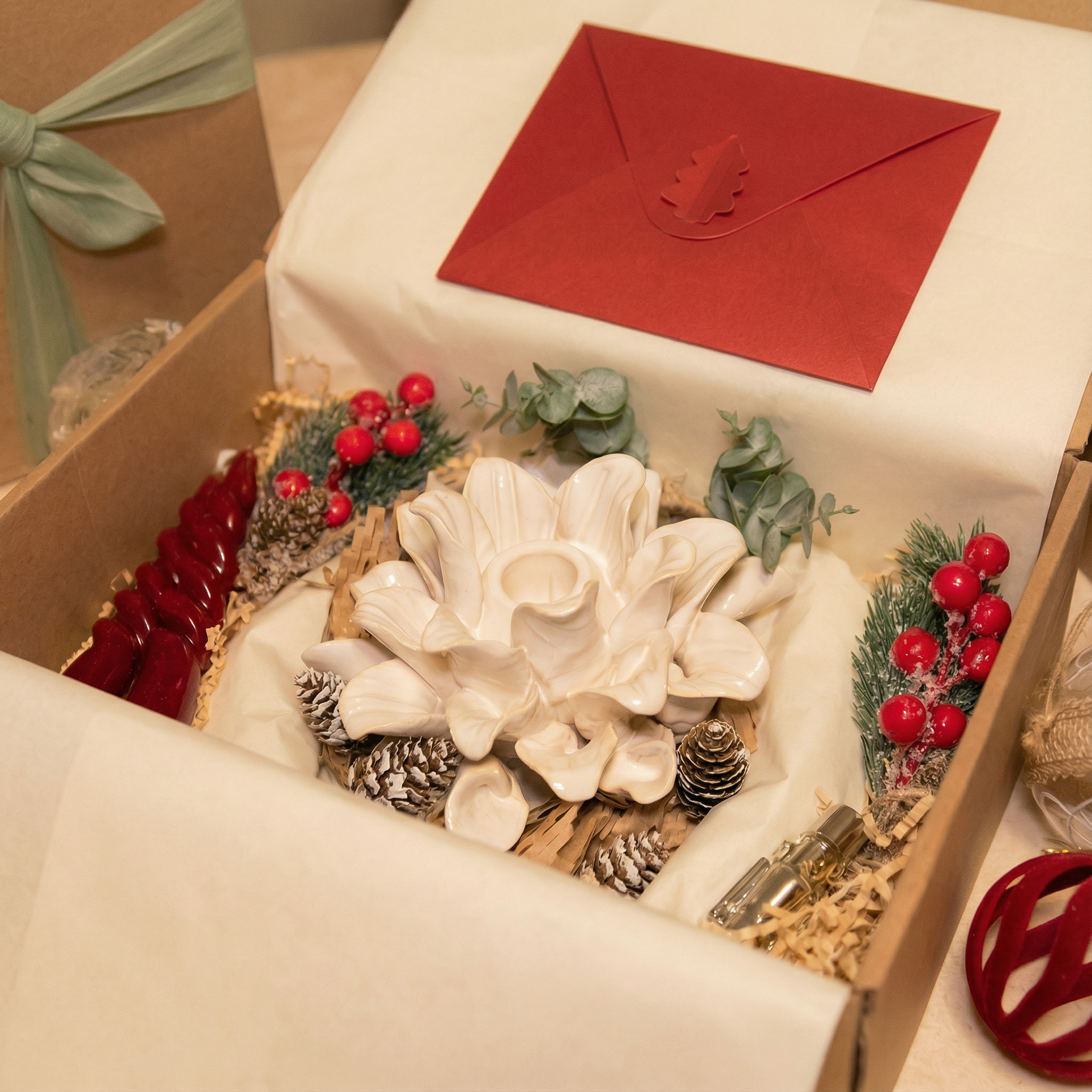 Der elegante, silberne Kerzenhalter bildet das Herzstück des Sets und reflektiert das warme Licht der enthaltenen Duftkerze. Abgerundet mit winterlichen Zweigen, zarten Grüntönen und hochwertigen Textildetails entsteht ein harmonisches Arrangement, das jede Einrichtung aufwertet.
